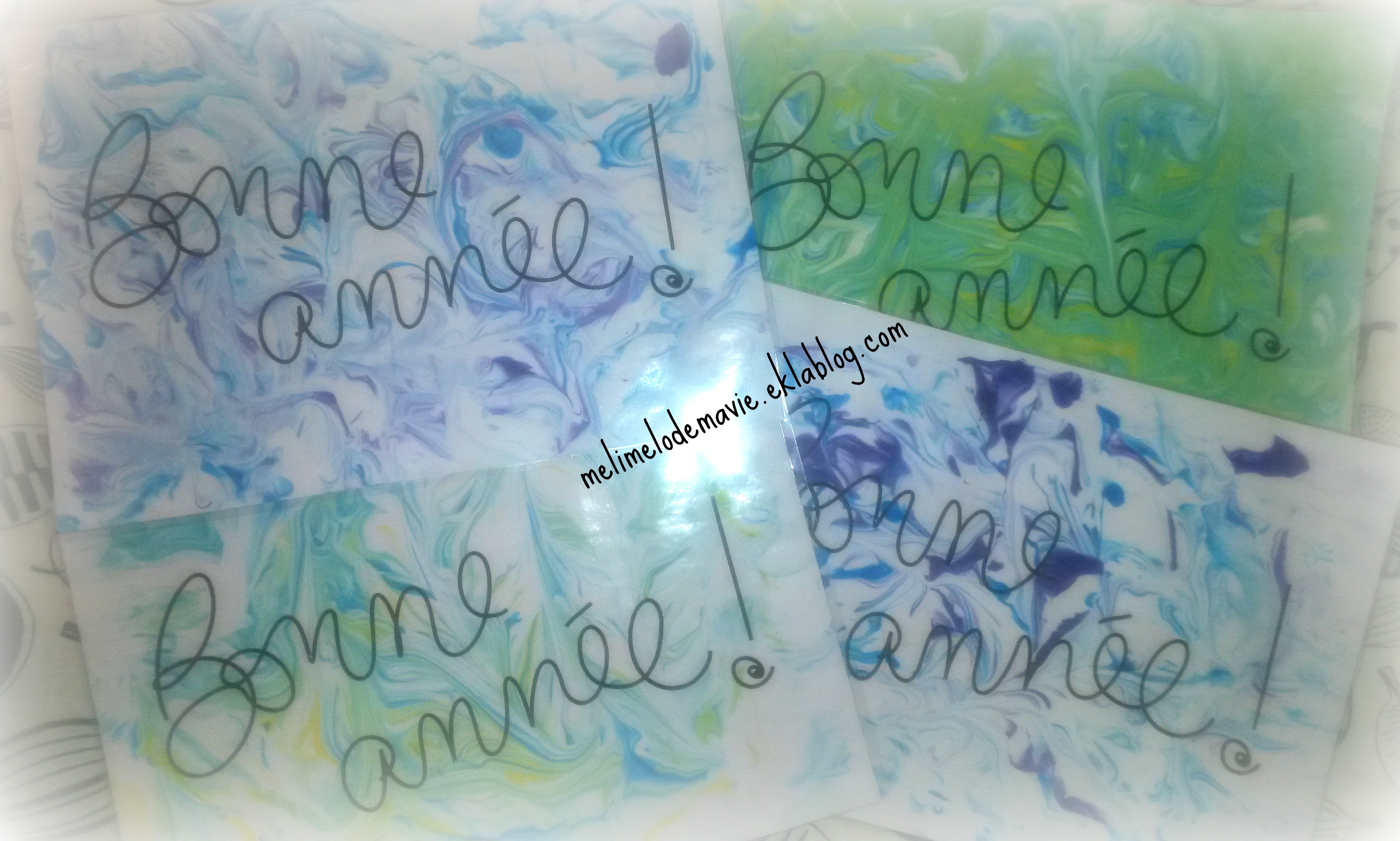 1ère étape: Impression du fond. Nous avons choisi quelque chose de très sobre: Bonne année! avec une jolie écriture.